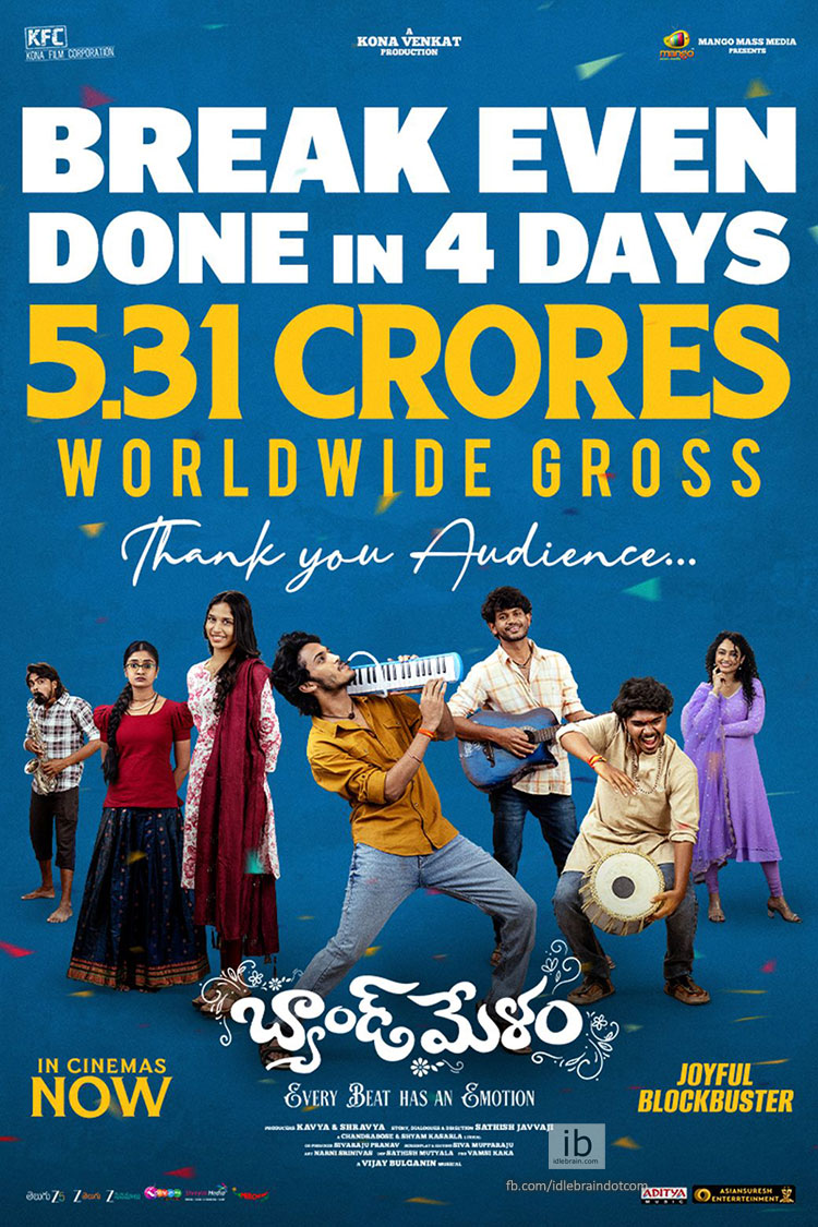 In four days, the film grossed ₹5.31 crores at the box office and has already achieved breakeven. This is a huge success for a film made with heart. Band Melam collected a massive ₹1.67 crores in Nizam and a solid ₹2 crores in Andhra. With decent collections from Bangalore, Ceeded, Chennai, overseas markets, Odisha, and North India, the film has become a profitable venture for everyone involved.