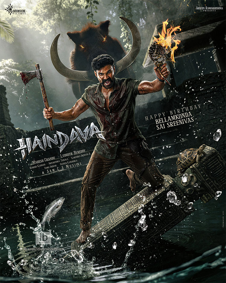 Extending birthday wishes to Bellamkonda Sai Sreenivas, the makers released a special poster. Sporting a fierce, mass-packed look, he stands atop a half-submerged ancient structure, drenched in water and streaked with blood. In one hand, he grips a bloodied axe, while in the other, he holds a flaming, mask. Towering behind him is a massive, menacing wild boar with glowing eyes and enormous tusks, heightening the sense of danger and raw intensity.