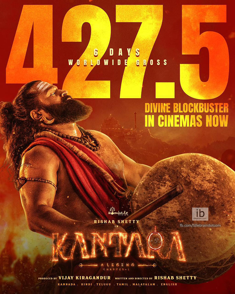 తాజాగా ఈ చిత్ర నిర్మాణ సంస్థ 'కాంతార చాప్టర్ 1' కలక్షన్ల వివరాలను అధికారికంగా విడుదల చేసింది. విడుదలైన ఆరు రోజులైనే ఈ చిత్రం 427 కోట్లకు పైగా గ్రాస్ సాధించినట్టు ఆ సంస్థ తెలిపింది. విదేశాల్లో సైతం ఈ చిత్రం అదిరిపోయే కలక్షన్లు రాబట్టుకుంటుంది. ఒక్క నార్త్ అమెరికాలోనే ఈ చిత్రం 3 మిలియన్ డాలర్ల వసూళ్లు సాధించడం గమనార్హం.