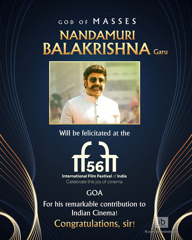 సమాచార ప్రసార మంత్రిత్వ శాఖ ఆధ్వర్యంలోని నేషనల్ ఫిల్మ్ డెవలప్మెంట్ కార్పొరేషన్ (NFDC), గోవా ప్రభుత్వంతో కలిసి ఎంటర్టైన్మెంట్ సొసైటీ ఆఫ్ గోవా (ESG) సంయుక్తంగా నిర్వహిస్తున్న 56వ భారత అంతర్జాతీయ చలనచిత్రోత్సవం (IFFI) ఈ ఏడాది నవంబర్ 20న జరగనున్న ఆరంభ వేడుకలో తెలుగు సినిమా ఐకాన్, పద్మభూషణ్ శ్రీ నందమూరి బాలకృష్ణ గారిని ఘనంగా సత్కరించనుంది.