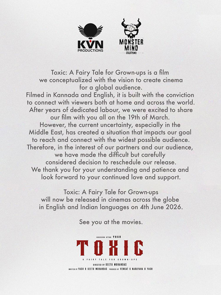 KVN Productions and Monster Mind Creations today announced a strategic rescheduling of the global theatrical release for the highly anticipated action-drama, Toxic: A Fairy Tale for Grown-ups. Originally slated for a worldwide premiere on March 19, 2026, the film’s release is being moved to 4th June, 2026, due to the ongoing volatile escalation and regional instability in the Middle East.